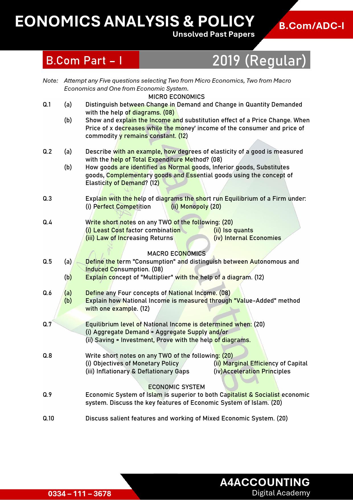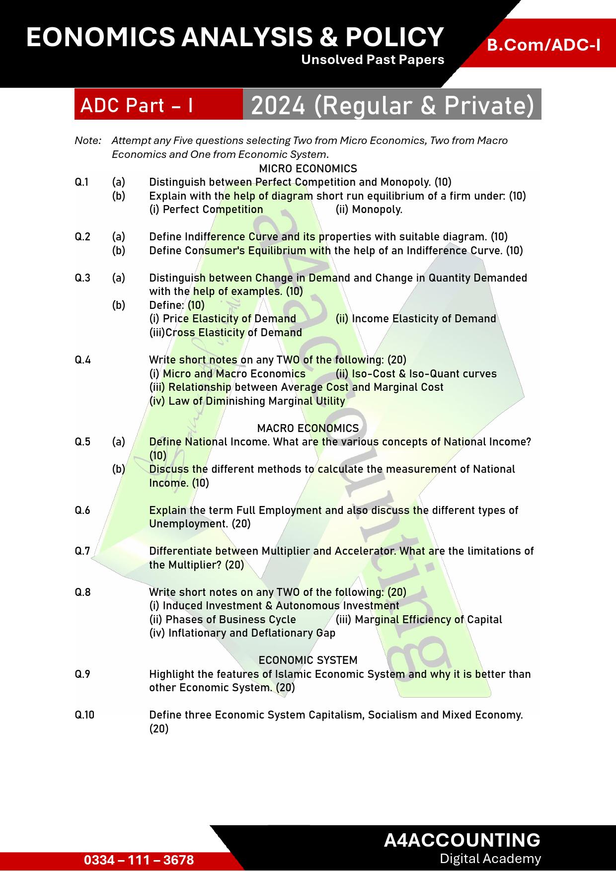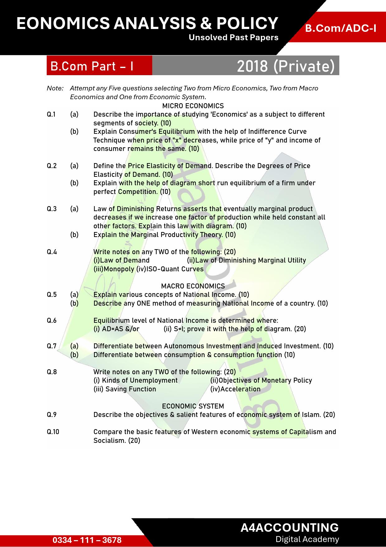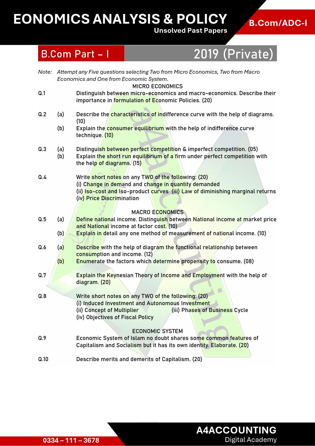 Unsolved Past Papers of Economics Analysis & Policy for both ADC Part - I & B.Com Part - I