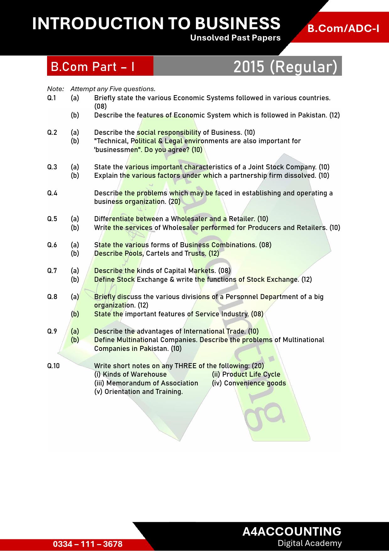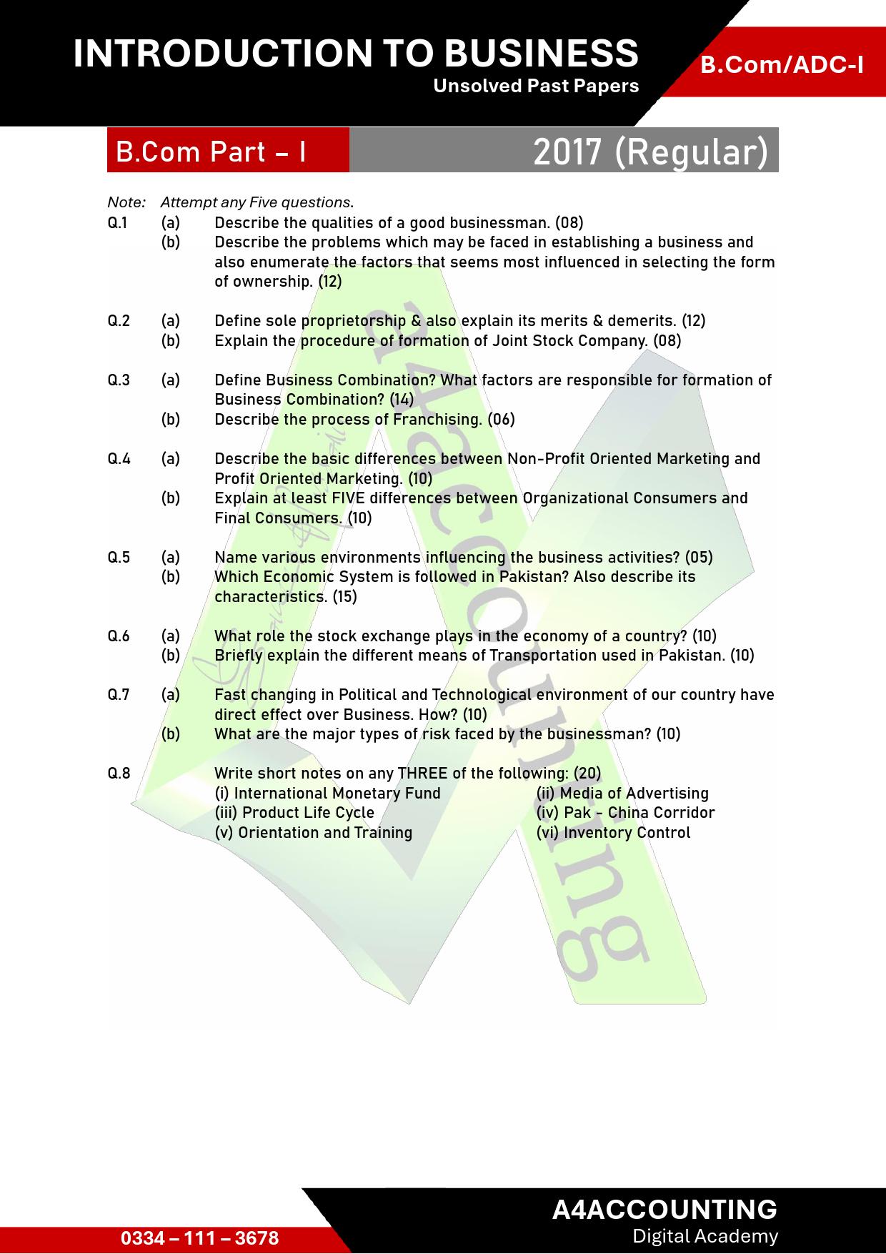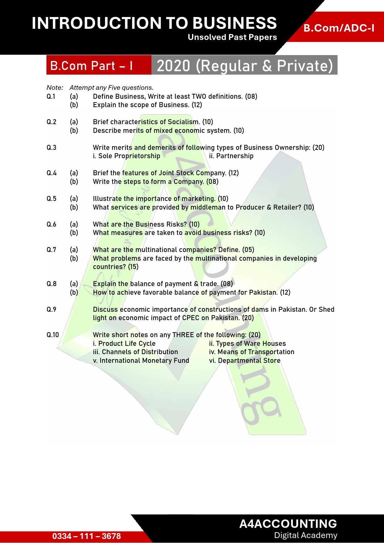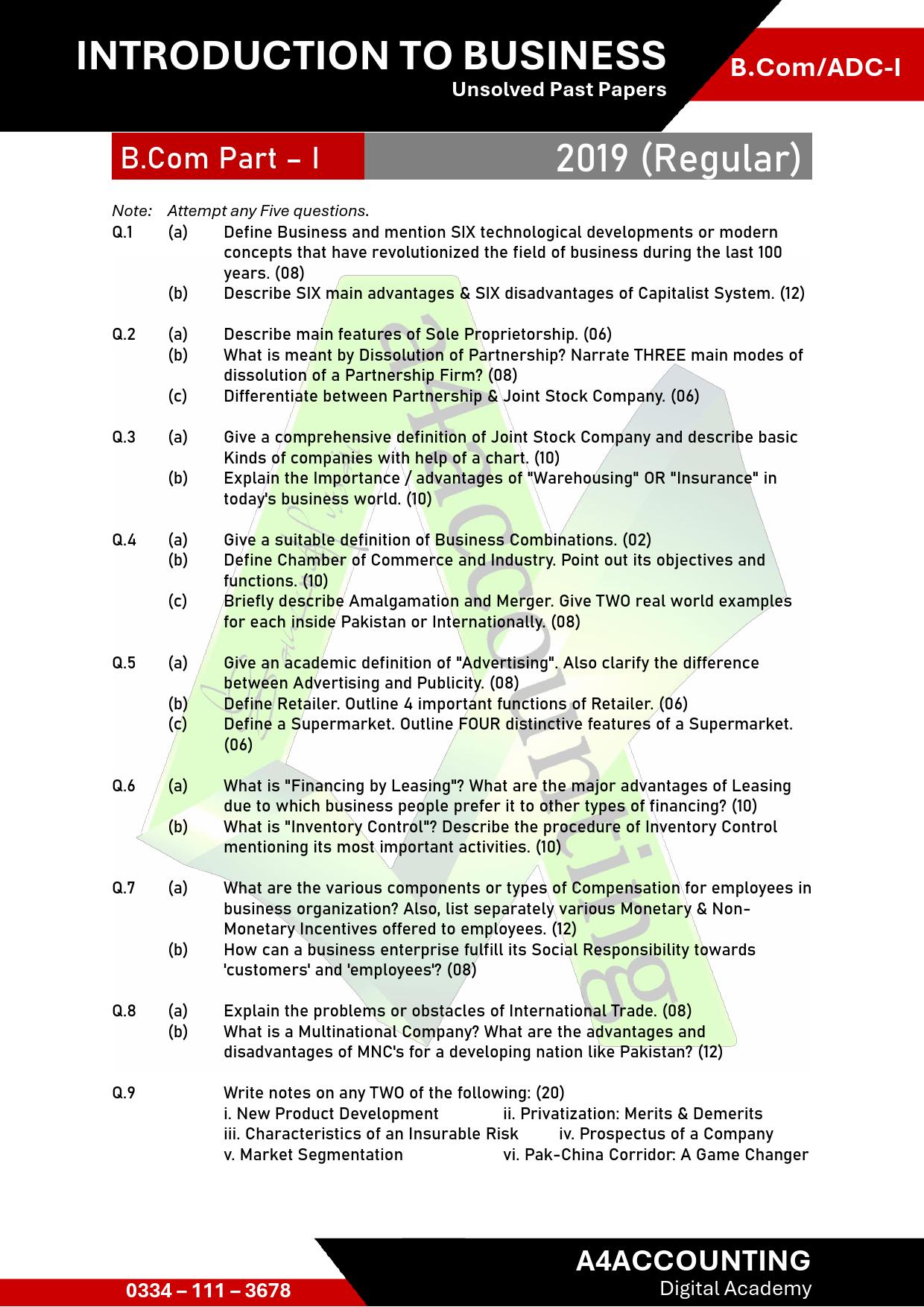 ADC/B.Com-I: Past Papers Introduction to Business