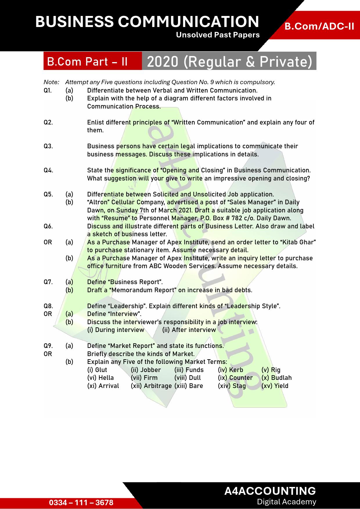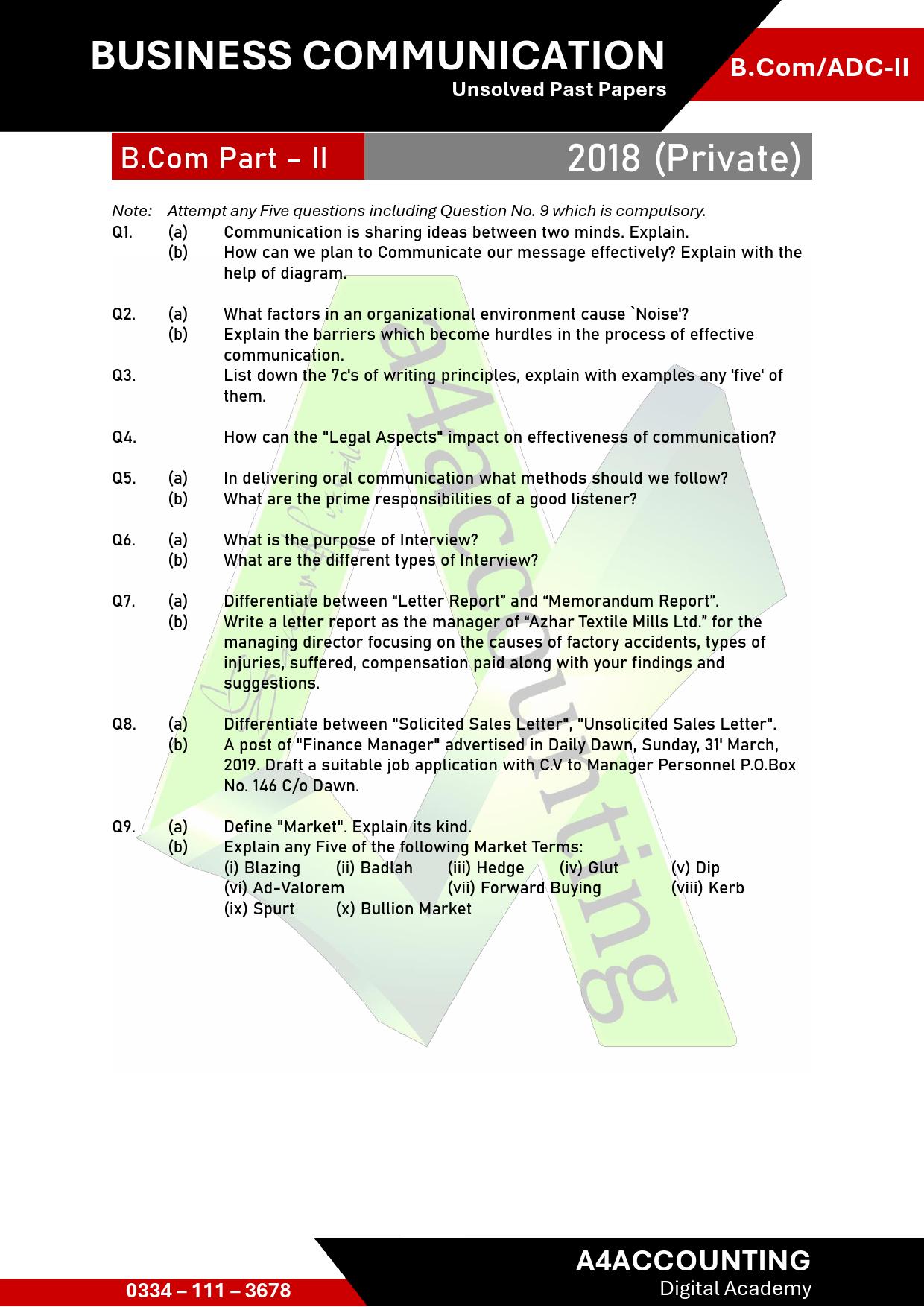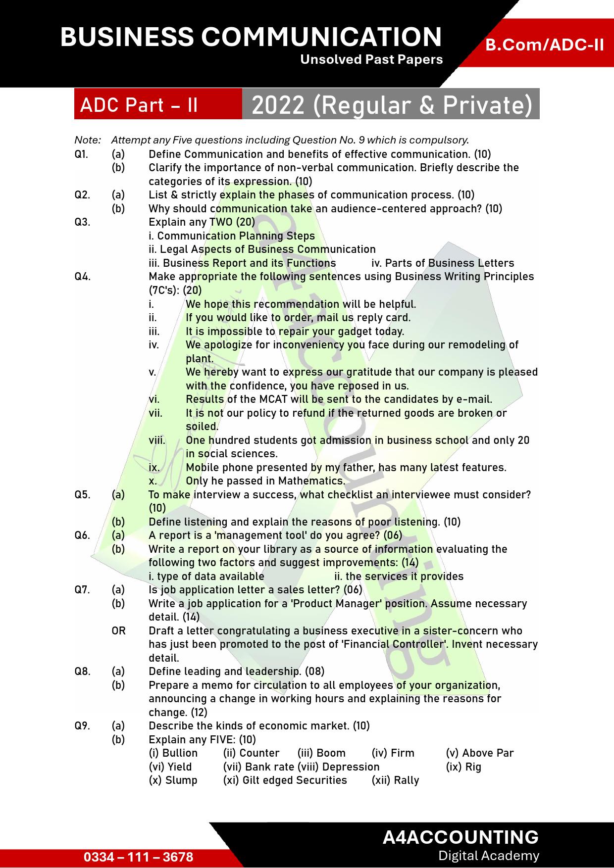 Unsolved Past Papers of Business Communication for both ADC Part - II & B.Com Part - II