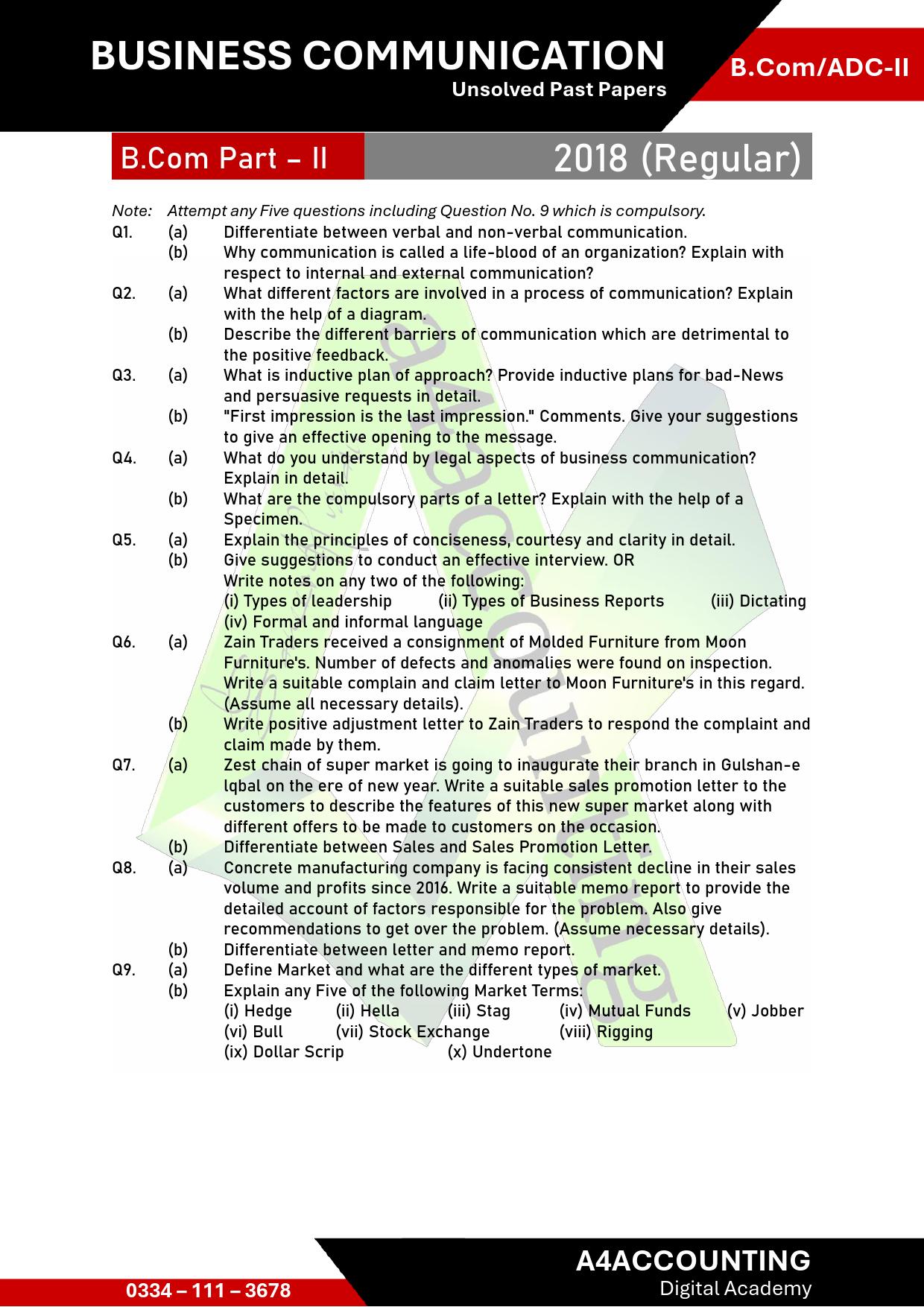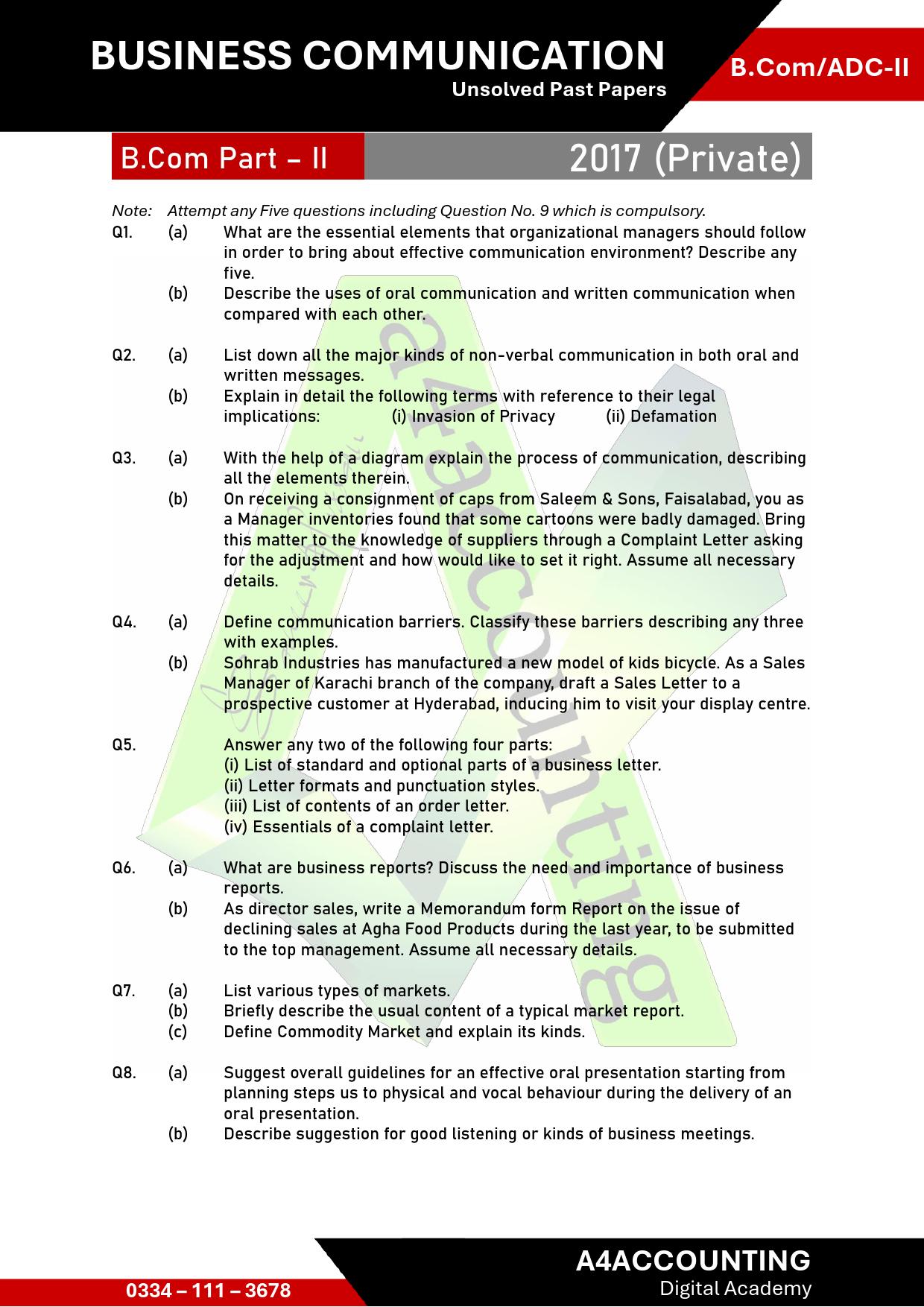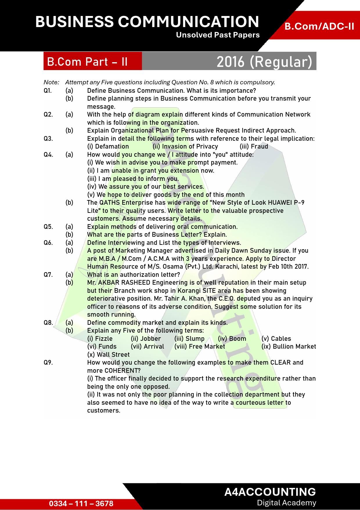 Unsolved Past Papers of Business Communication for both ADC Part - II & B.Com Part - II