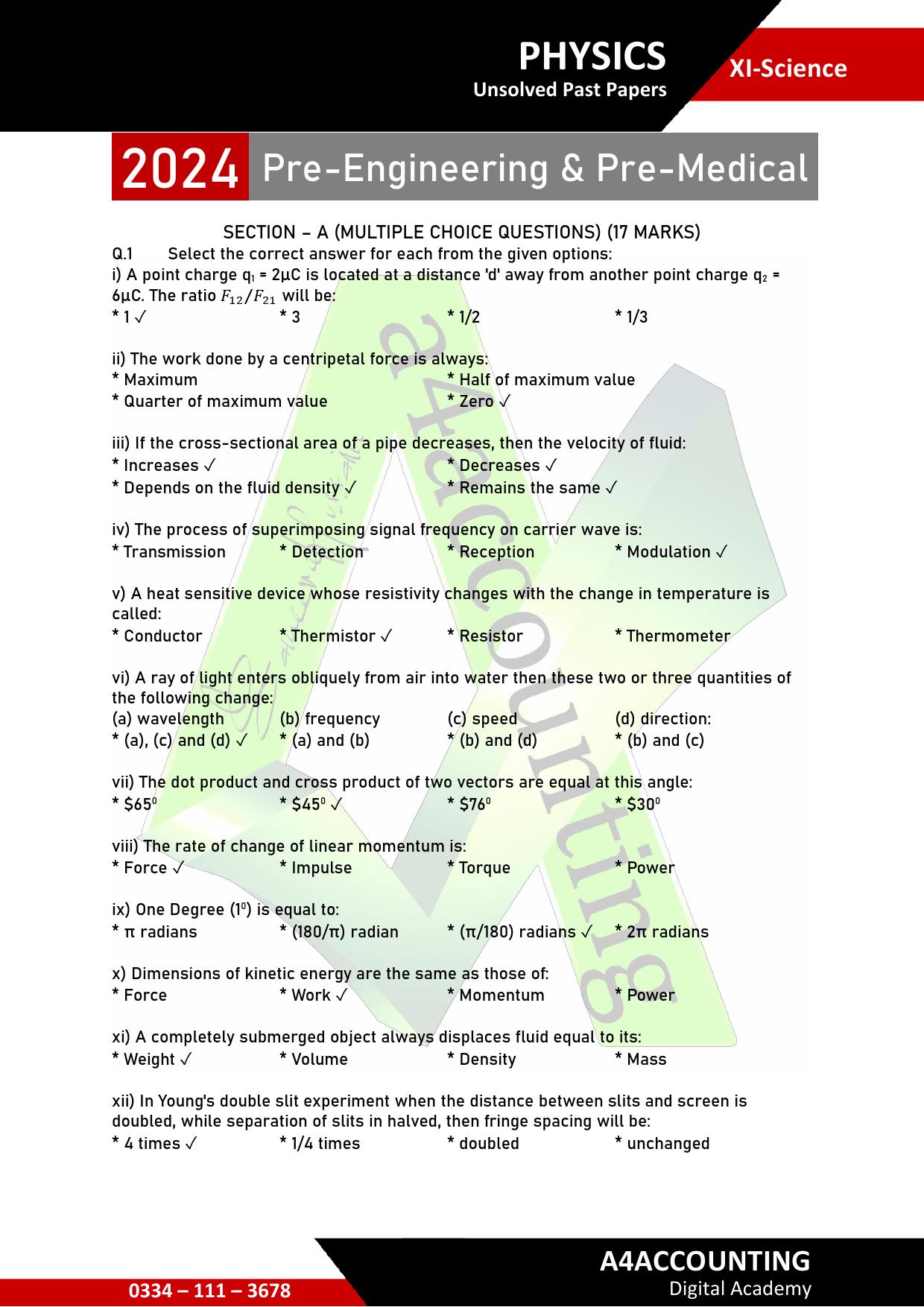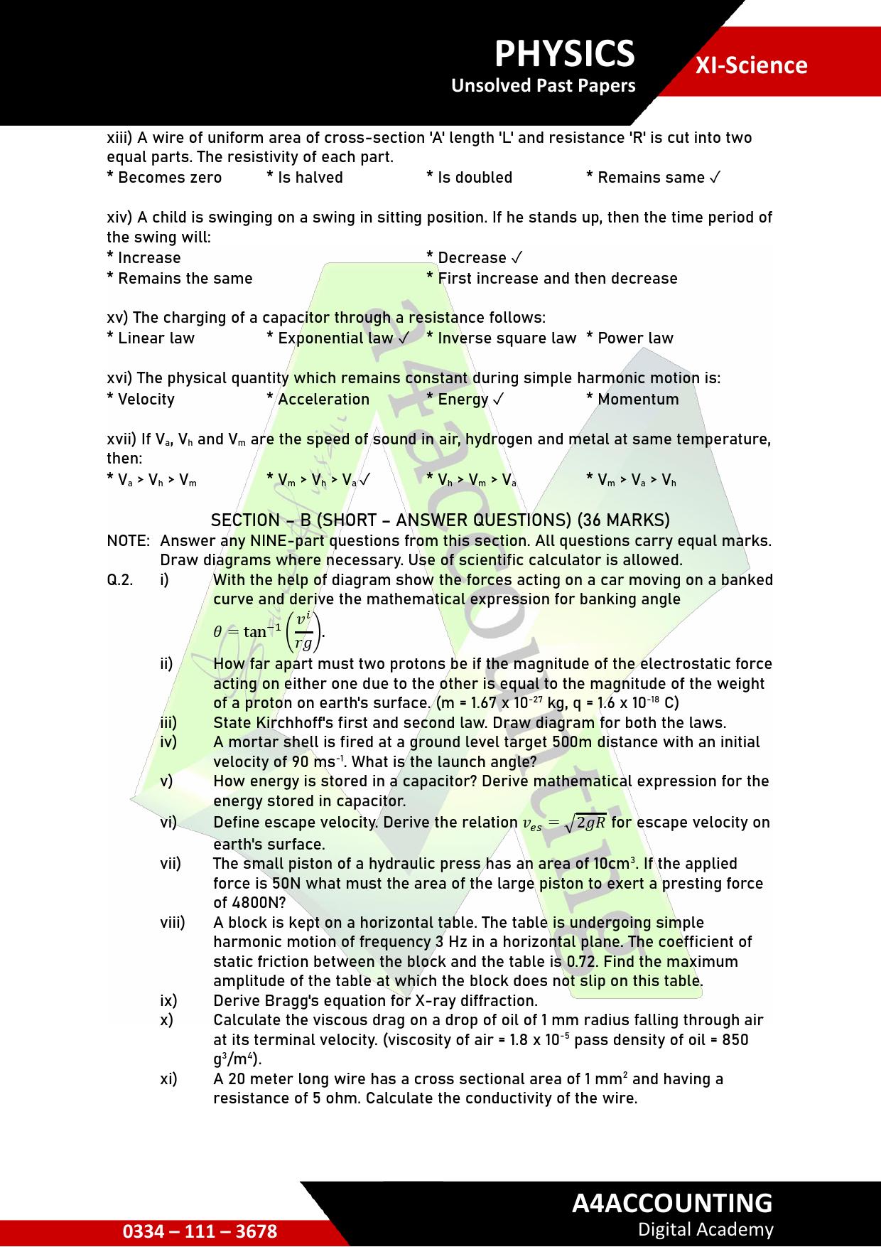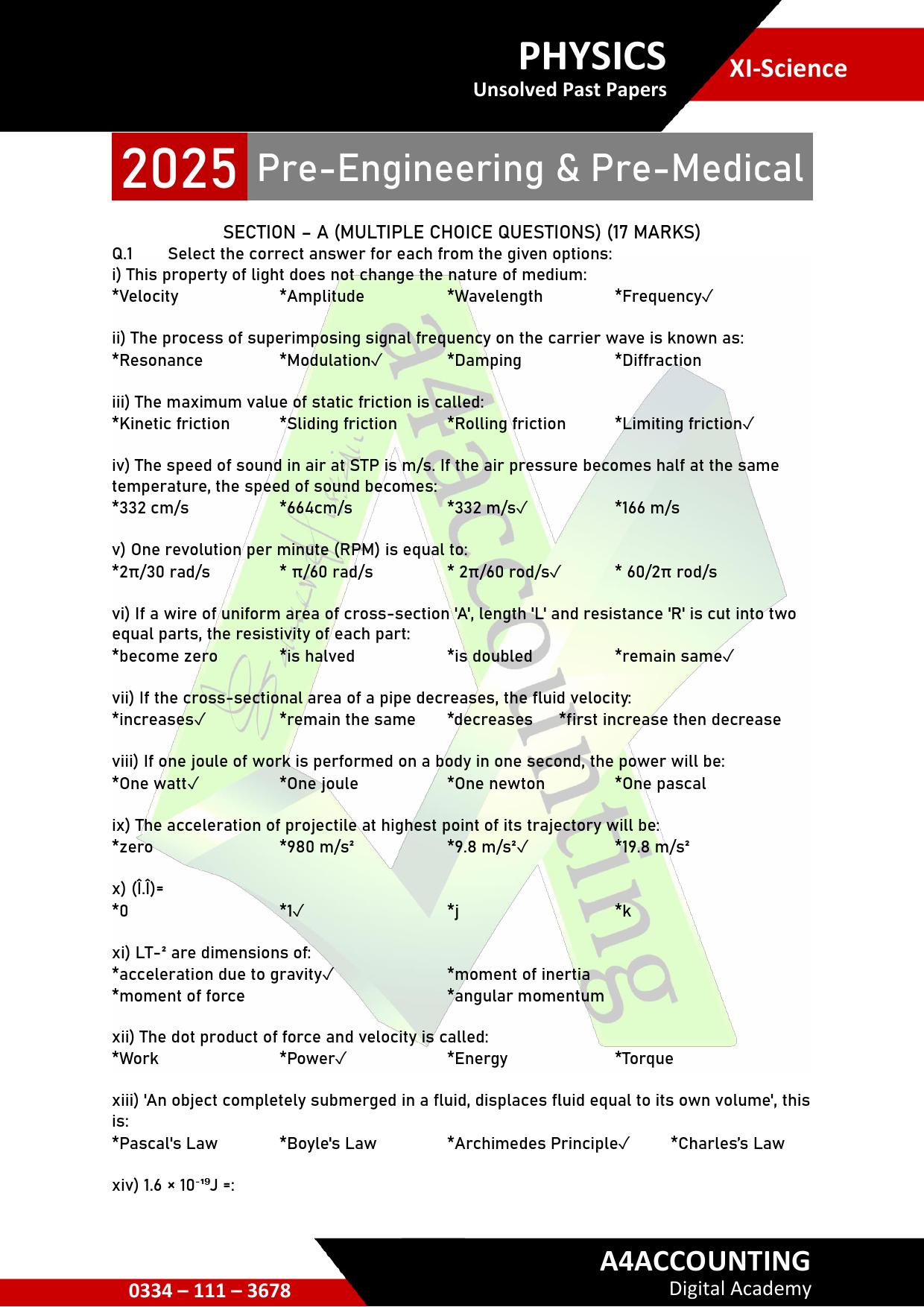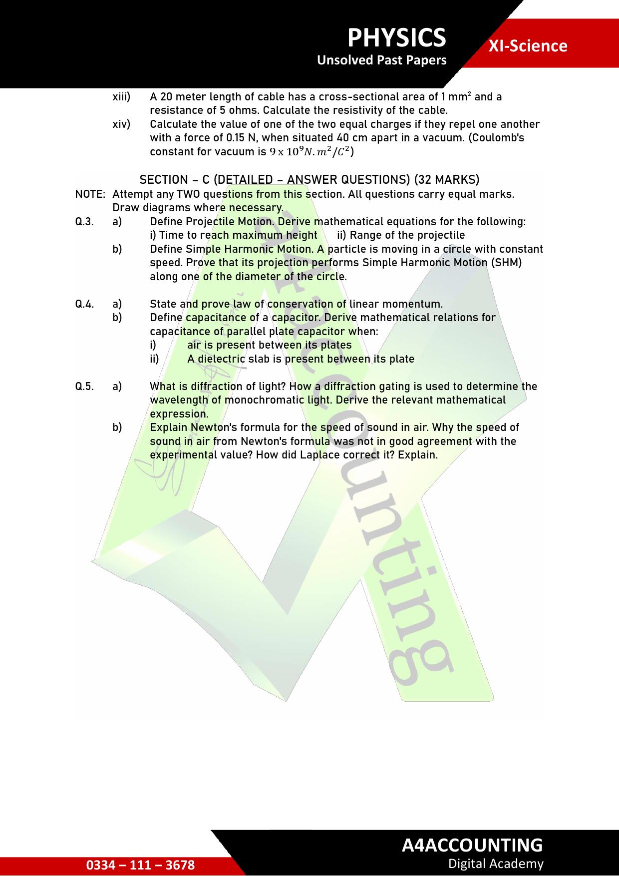 Unsolved Past Papers of Physics for XI (Pre-Engineering, Pre-Medical & General Science Groups)