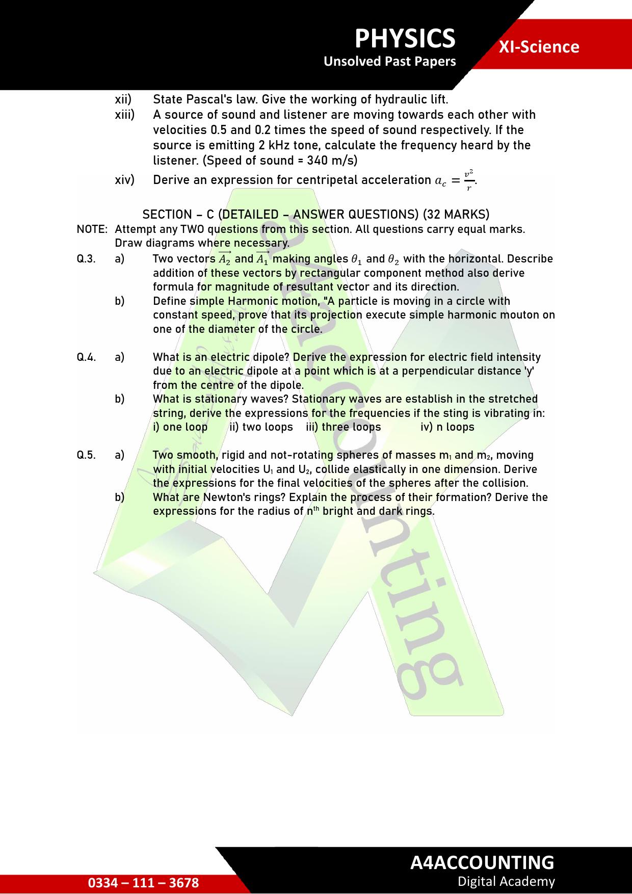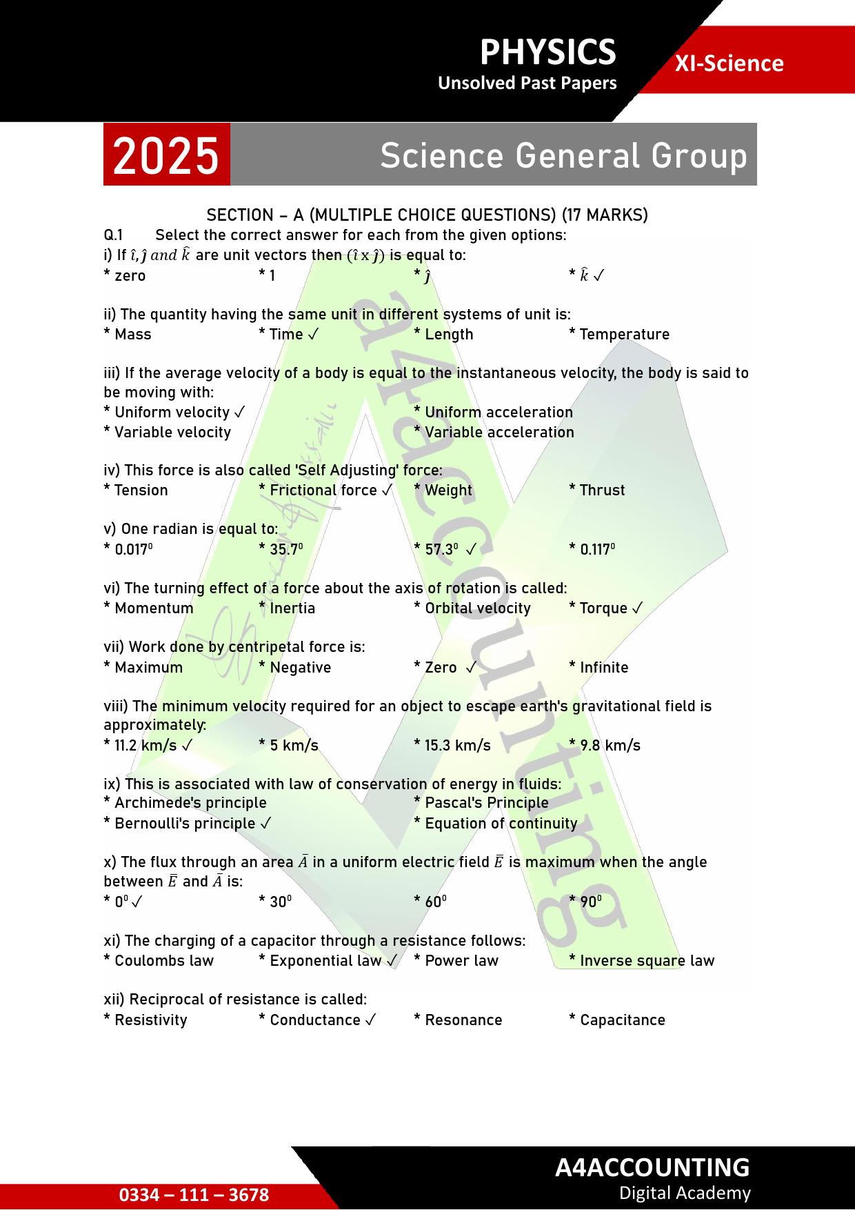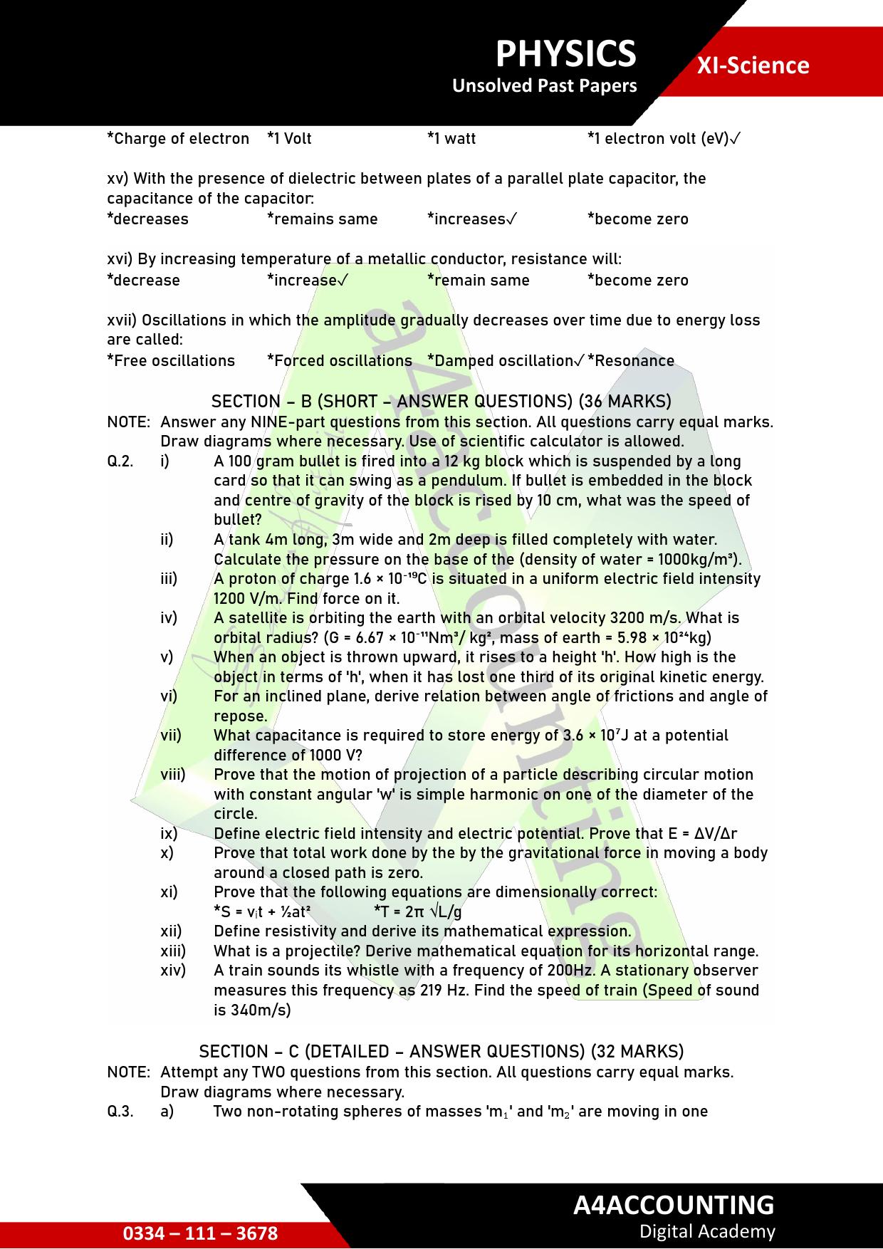 Unsolved Past Papers of Physics for XI (Pre-Engineering, Pre-Medical & General Science Groups)