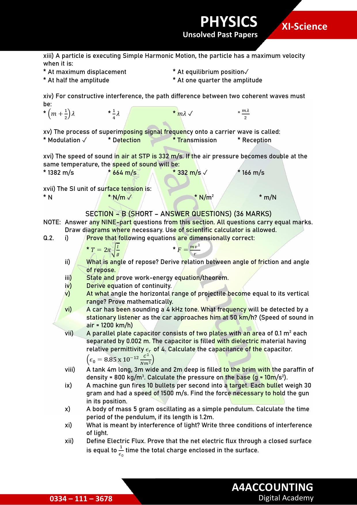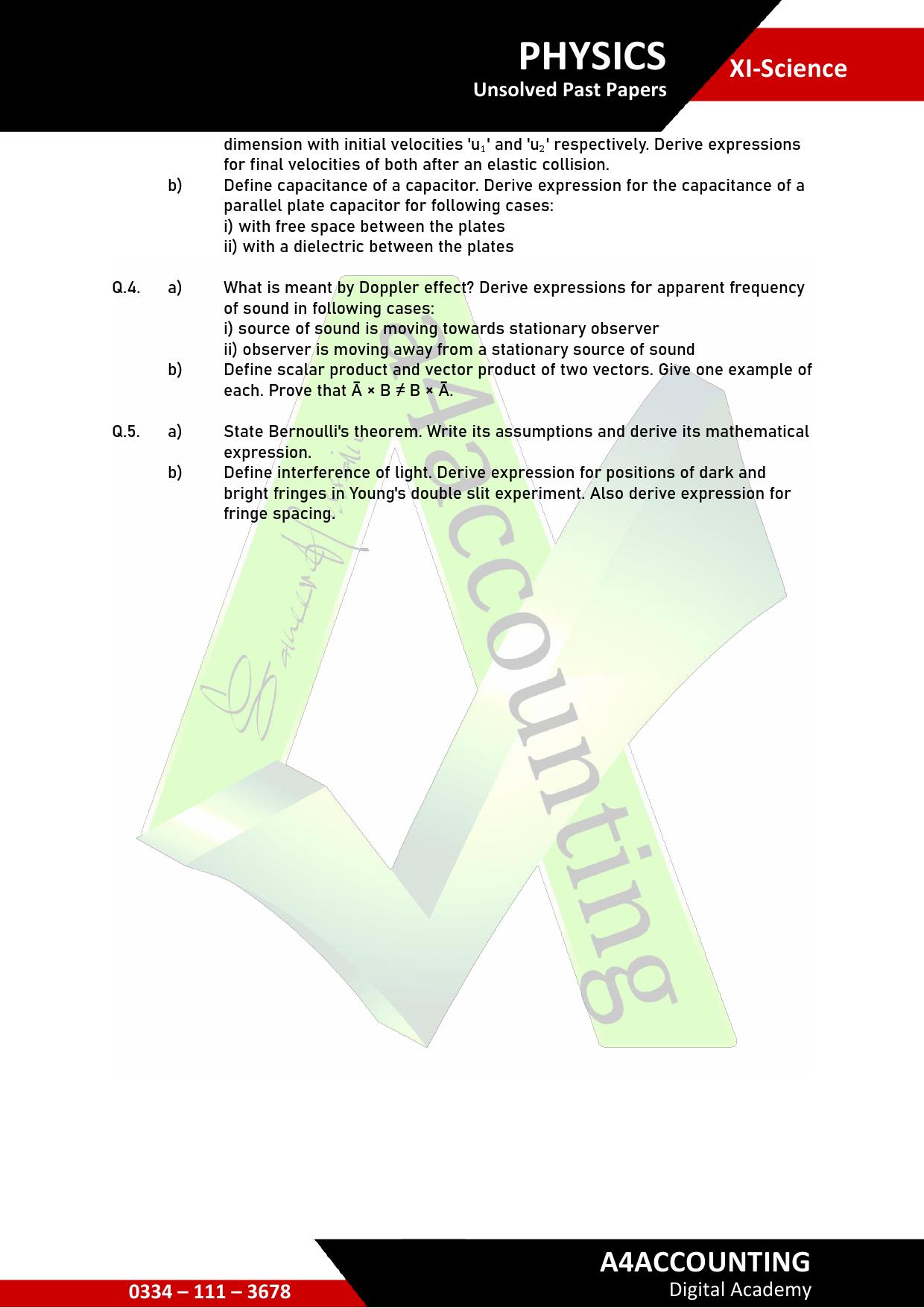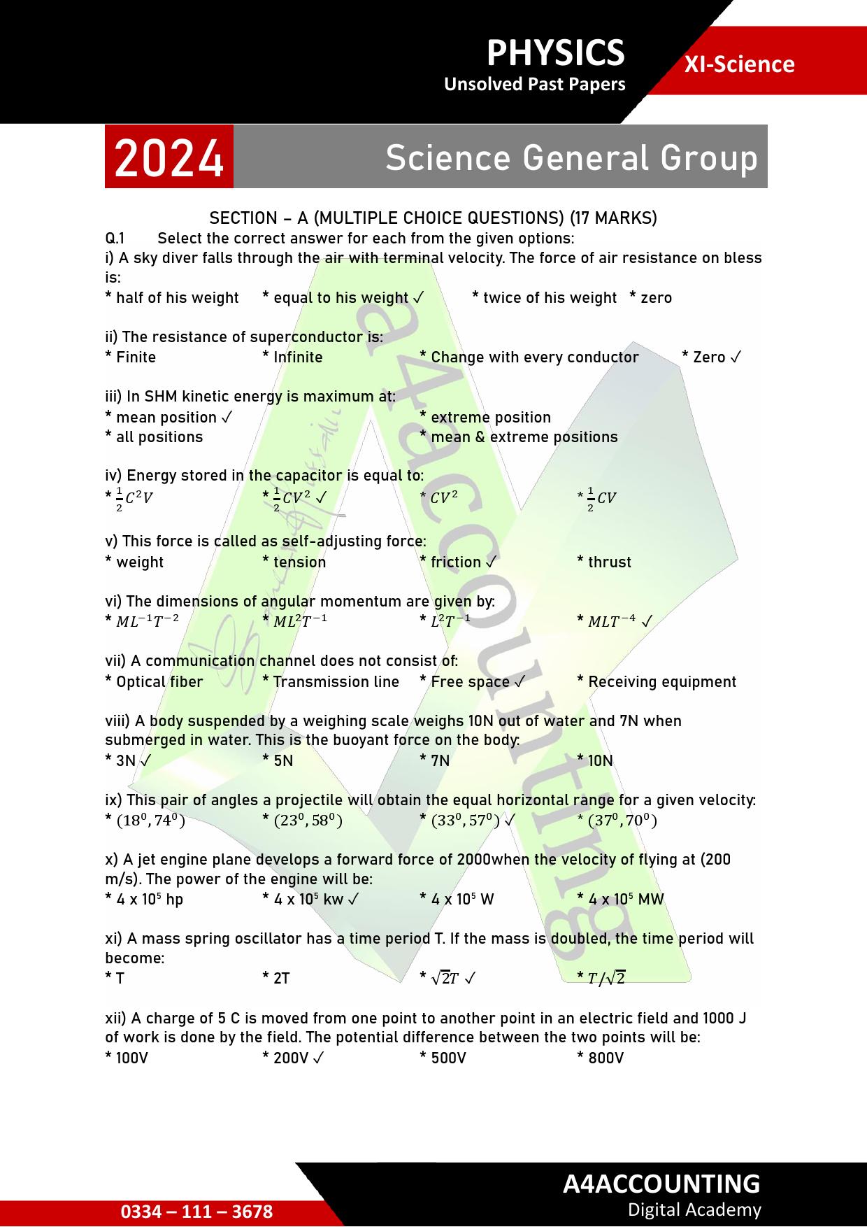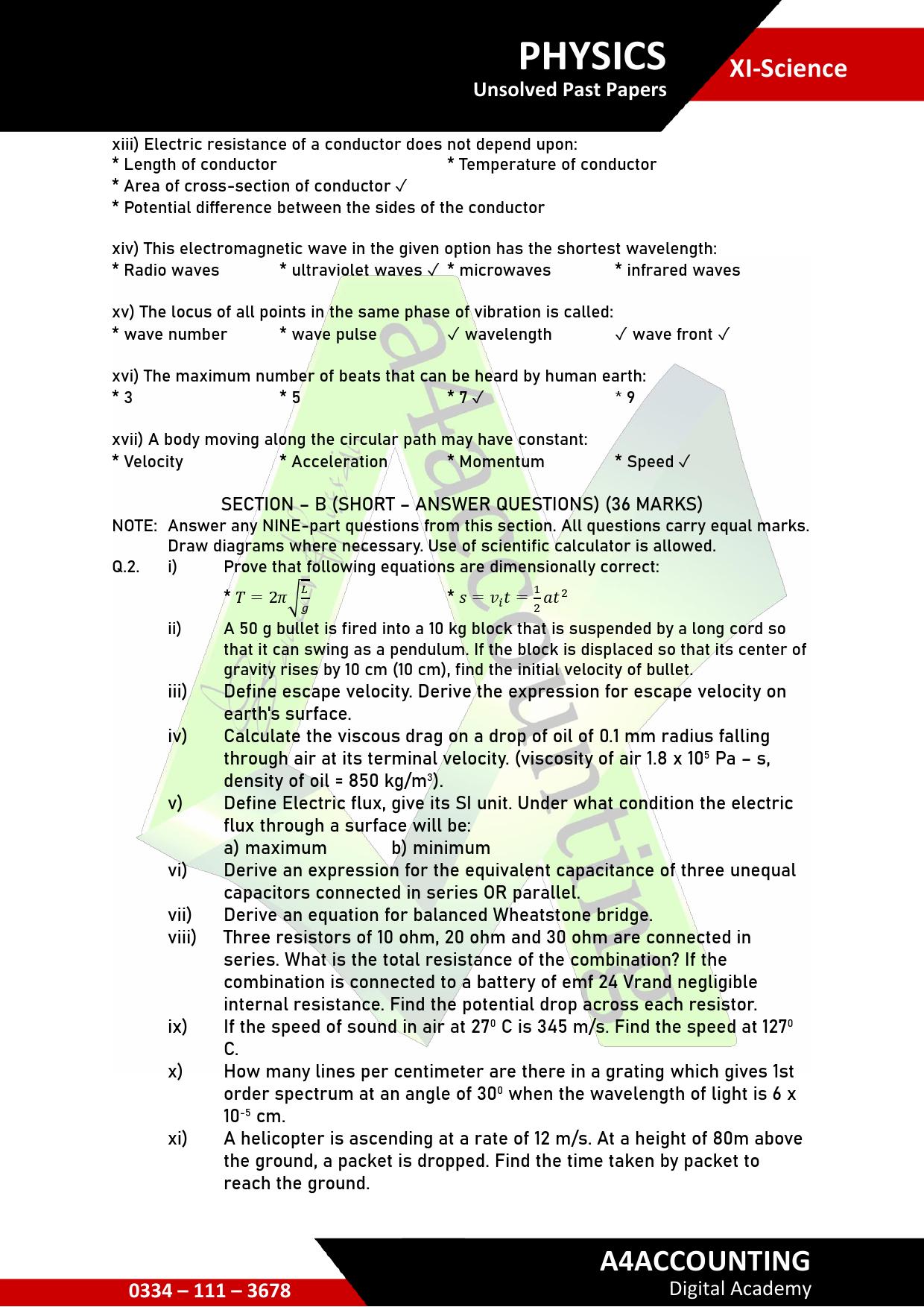 Unsolved Past Papers of Physics for XI (Pre-Engineering, Pre-Medical & General Science Groups)